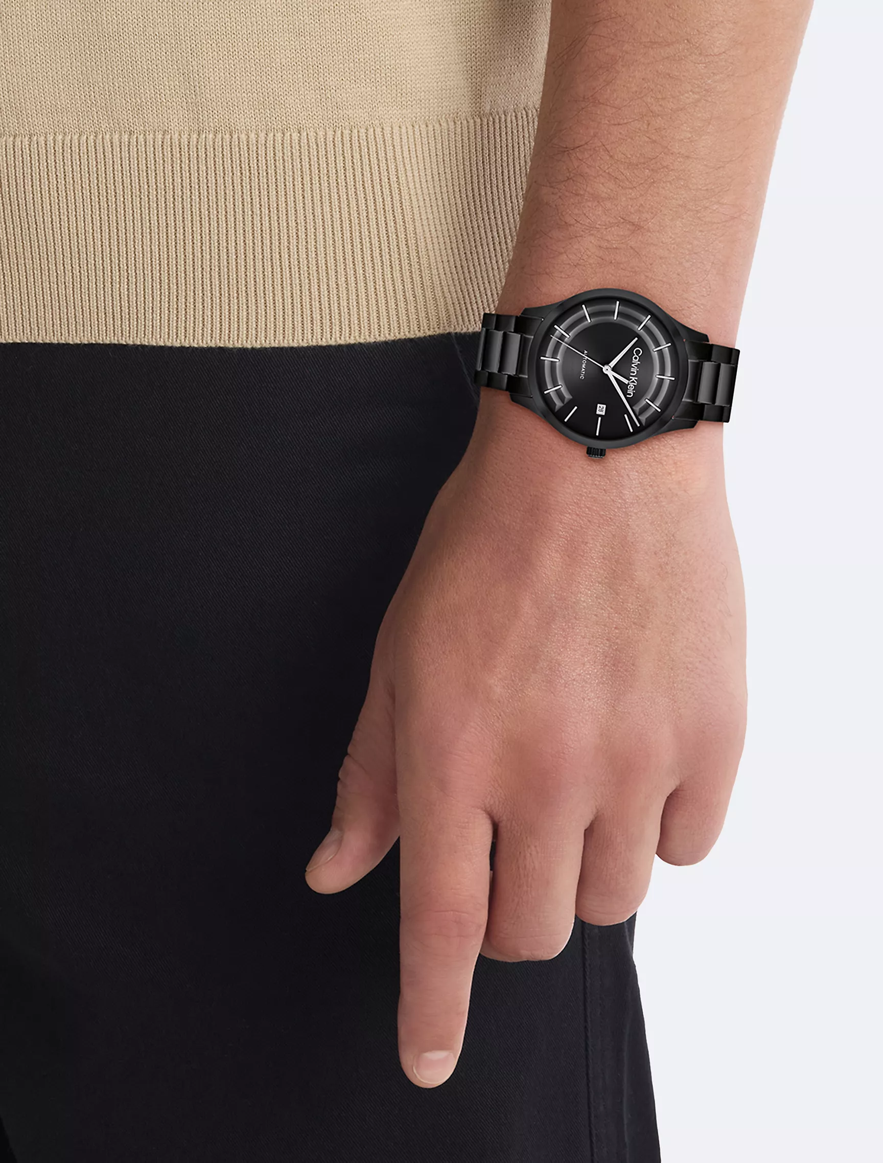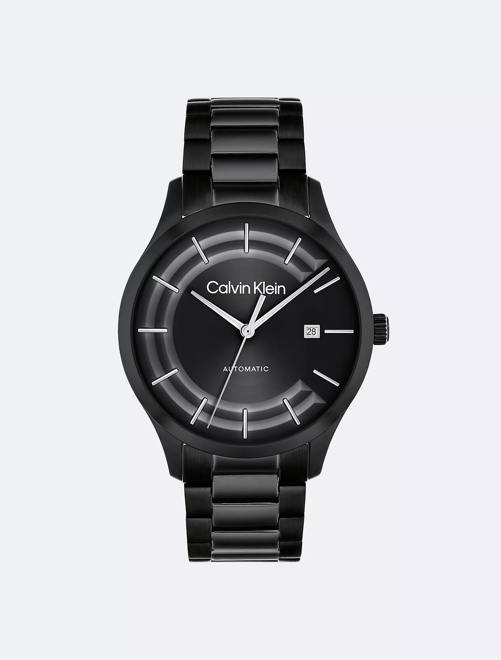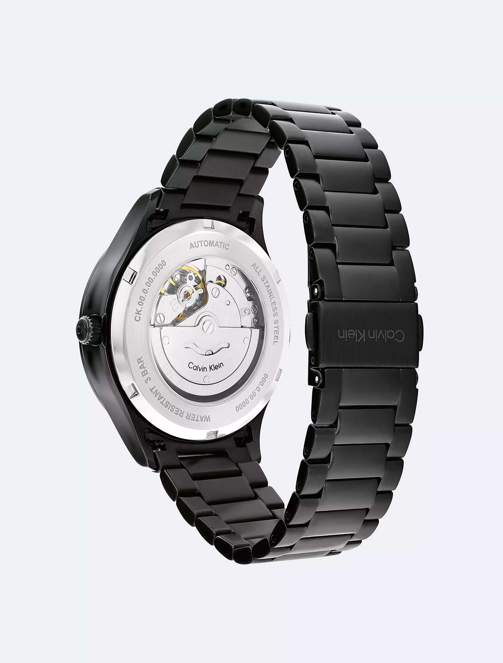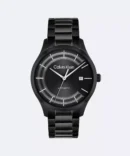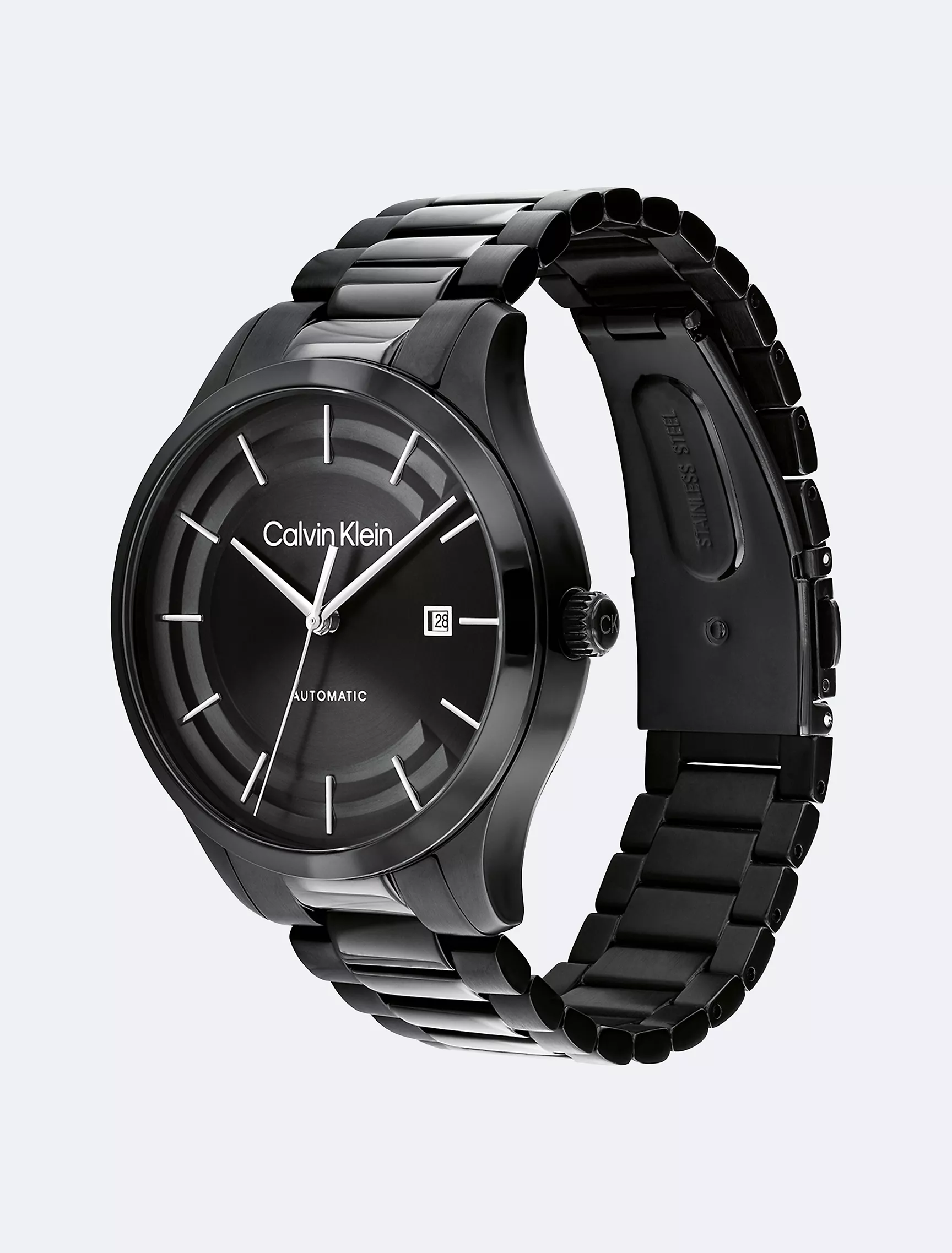 - The watch is finished with a black stainless steel bracelet.